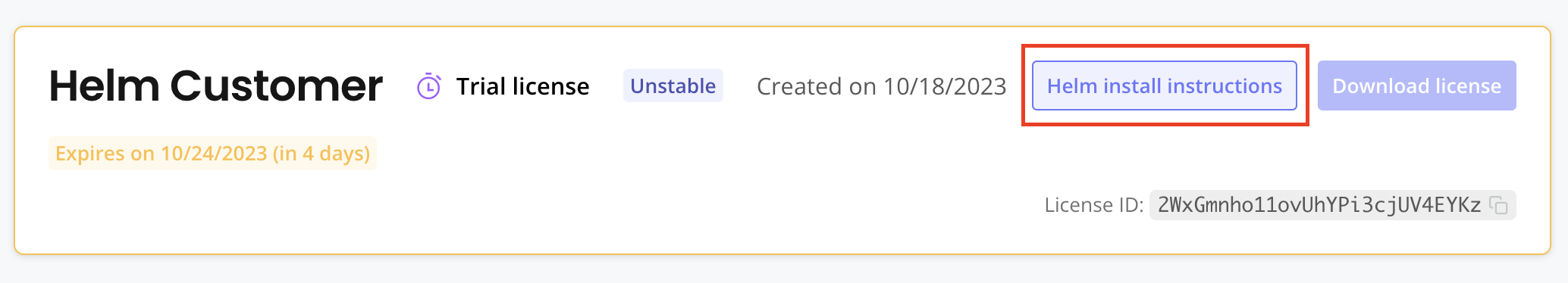 On the Customer details page for the customer that you created, click Helm install instructions.